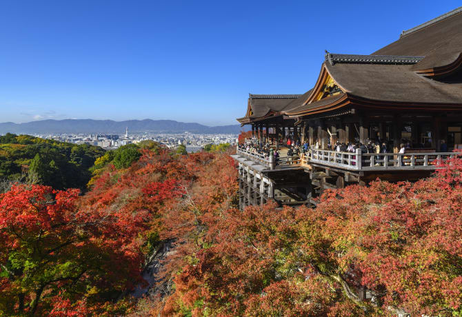 La extraordinaria arquitectura de la sala principal del templo Kiyomizudera es lo que lo convierte en un clásico del Patrimonio Mundial en Kioto. Una compleja red de pilares sostiene su gran plataforma, en la ladera de la montaña, algo que solo se ve en algunas estructuras de templos en Japón. También hace gala de técnicas tempranas resistentes a los terremotos, ya que la estructura carece por completo de clavos, lo cual permite que las juntas se muevan. Este lugar es muy popular, por lo que se recomienda madrugar.