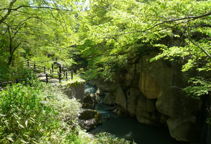 Después de visitar las cataratas, regresa al punto de información, desde donde puedes ir hasta la garganta de Rairai a 5 minutos a pie por un sendero de 1 kilómetro rodeado de piedras inmensas. Admira las vistas del cañón desde el puente de Nozoki-bashi.