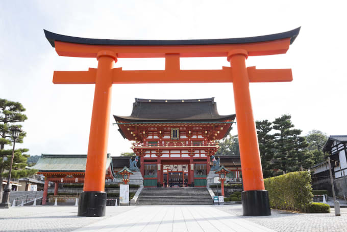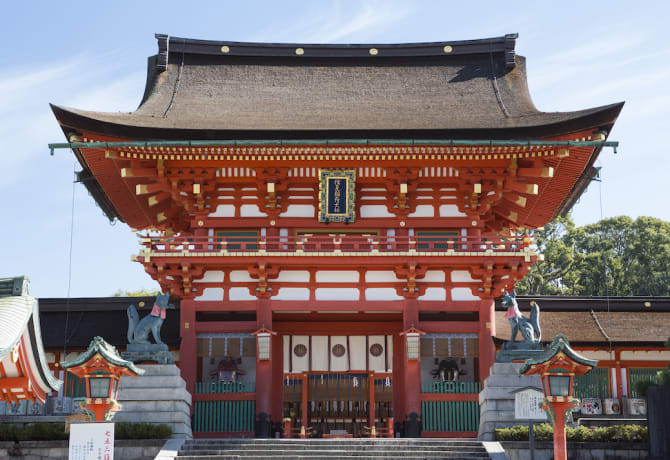 Au sud de la gare de Kyoto, dans une zone connue pour ses brasseries, le sanctuaire de Fushimi Inari Taisha attire les visiteurs vers son domaine paisible protégé par des Inari, les dieux renards. Les portails torii rouges forment des tunnels s'ouvrant sur une forêt derrière les bâtiments principaux. Pour un peu d'exercice, continuez sur le sentier boisé jusqu'au mont Inari qui culmine à 233 mètres.