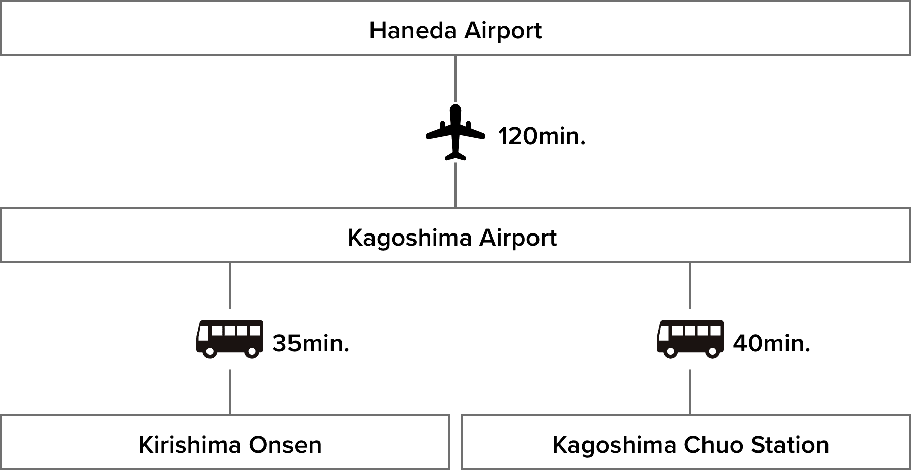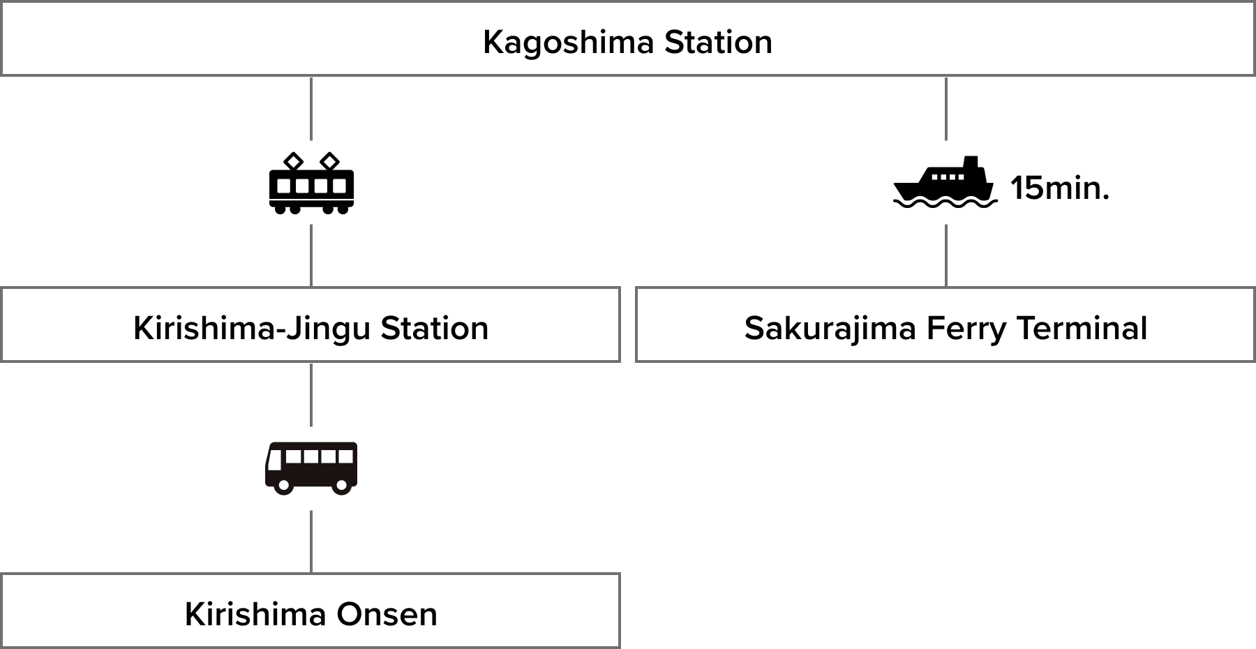 Frequent flights operate between Haneda Airport in Tokyo and Kagoshima Airport (120 min). Renting a car near Kagoshima Airport opens up more options than public transportation. To reach Sakurajima and the Kagoshima Bay area, drive to Kagoshima Port, then take a car ferry to Sakurajima Ferry Terminal. To reach the Kirishima area by public transportation, take a Kagoshima Kotsu bus to the Kirishima Iwasaki Hotel stop in the hot-spring town of Kirishima Onsen (35 min), which makes an excellent base for exploring. For the Kagoshima Bay area, take the airport shuttle to Kagoshima Chuo Station (40 min). From there, use the City Tram or local bus service to Kagoshima Port (20 min), or take the train to Kagoshima Station (5 min). The trip across the water to Sakurajima Ferry Terminal takes 15 minutes.